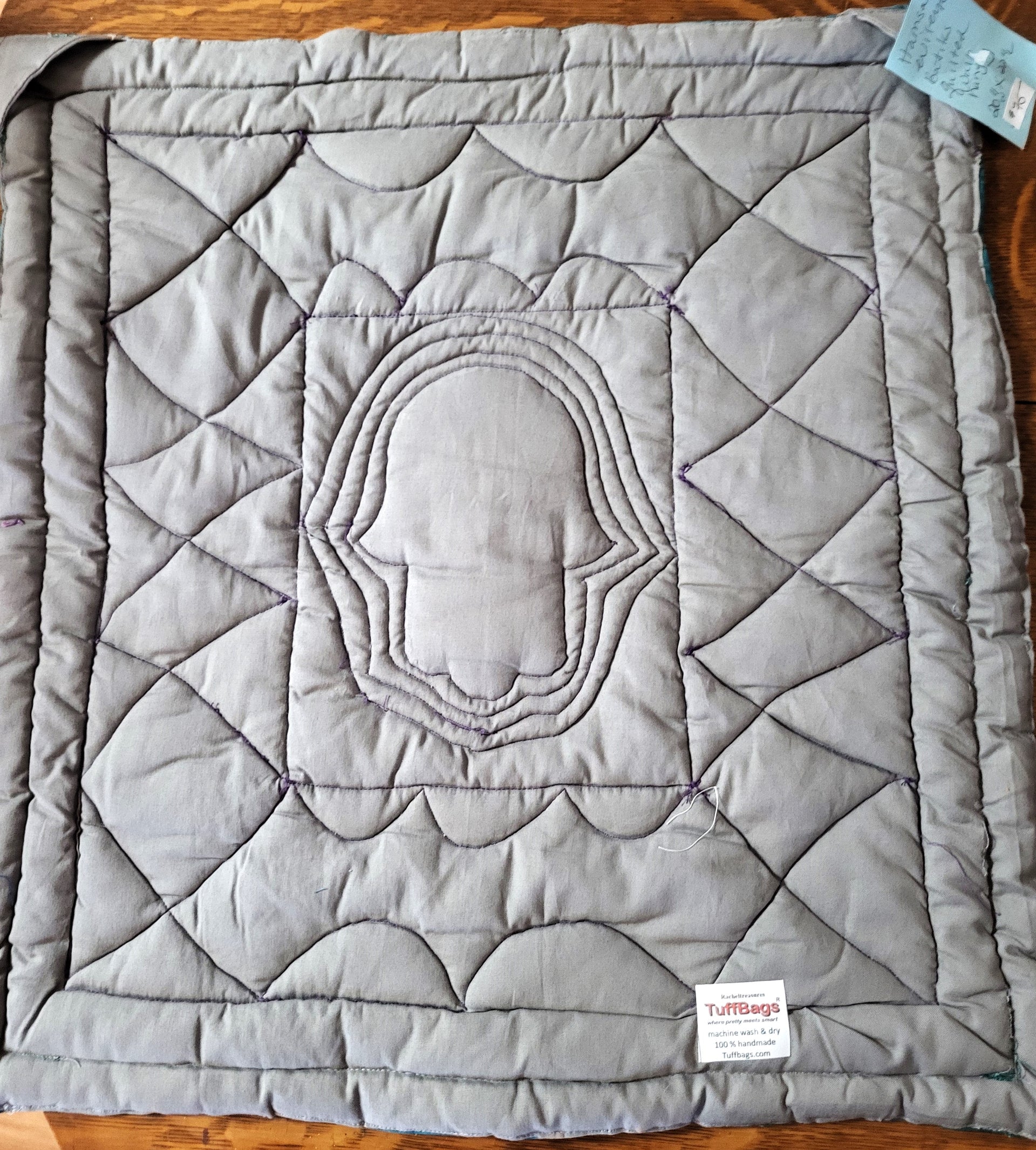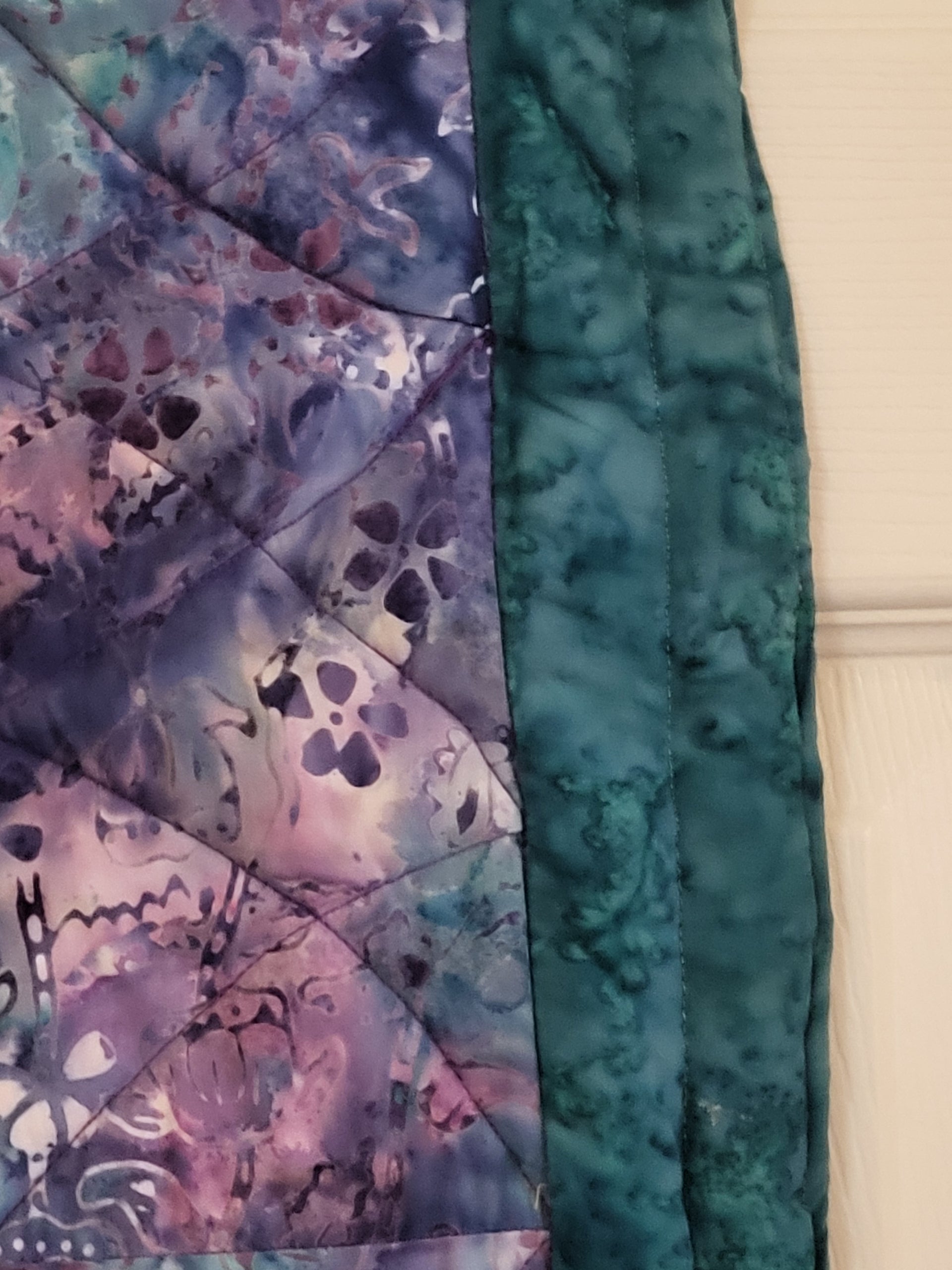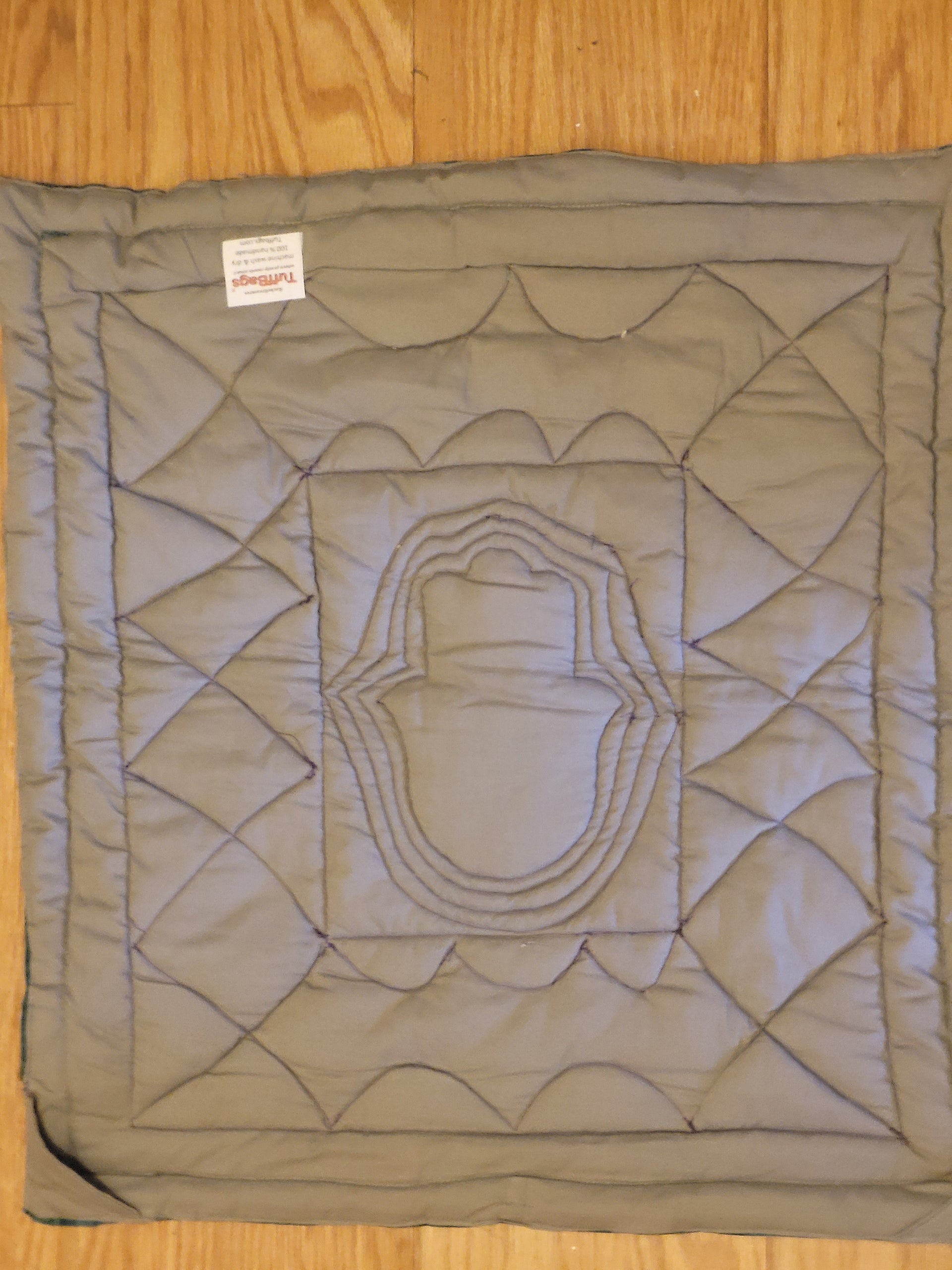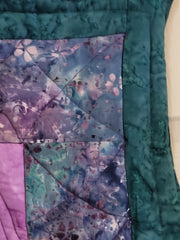 I surrounded the middle Hand of Fatima with an evil eye with a stunning teal, purple, blue flowers batik. The edging is a gorgeous coordinating teal. The back is a Kona cotton gray. I quilted all around the Hand of G-d, on the multicolored batik and the edging. Please see all of the pictures, as well as the reverse side in order to appreciate the detailed quilting. The back has two pockets to hold a dowel (Not included).