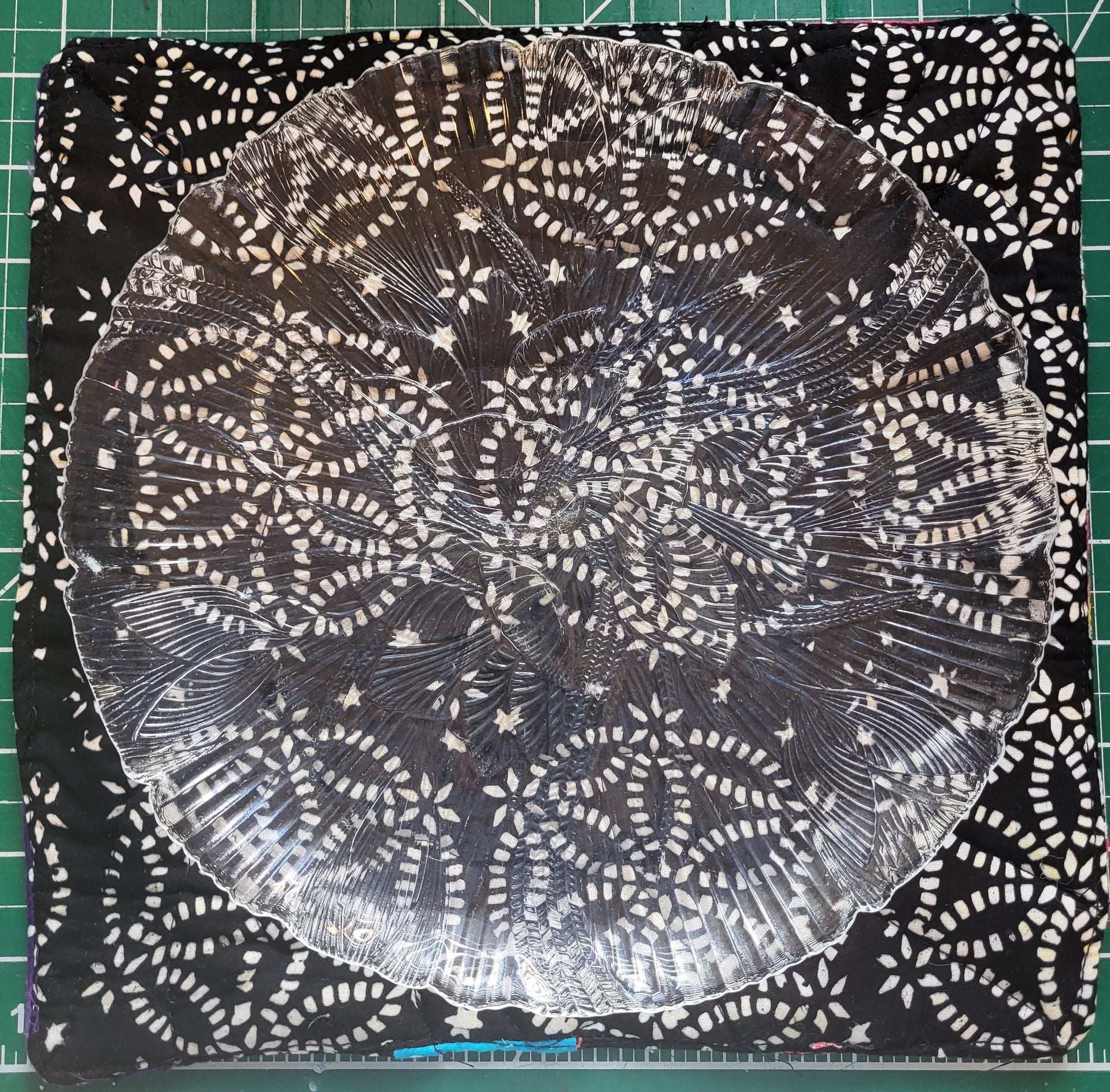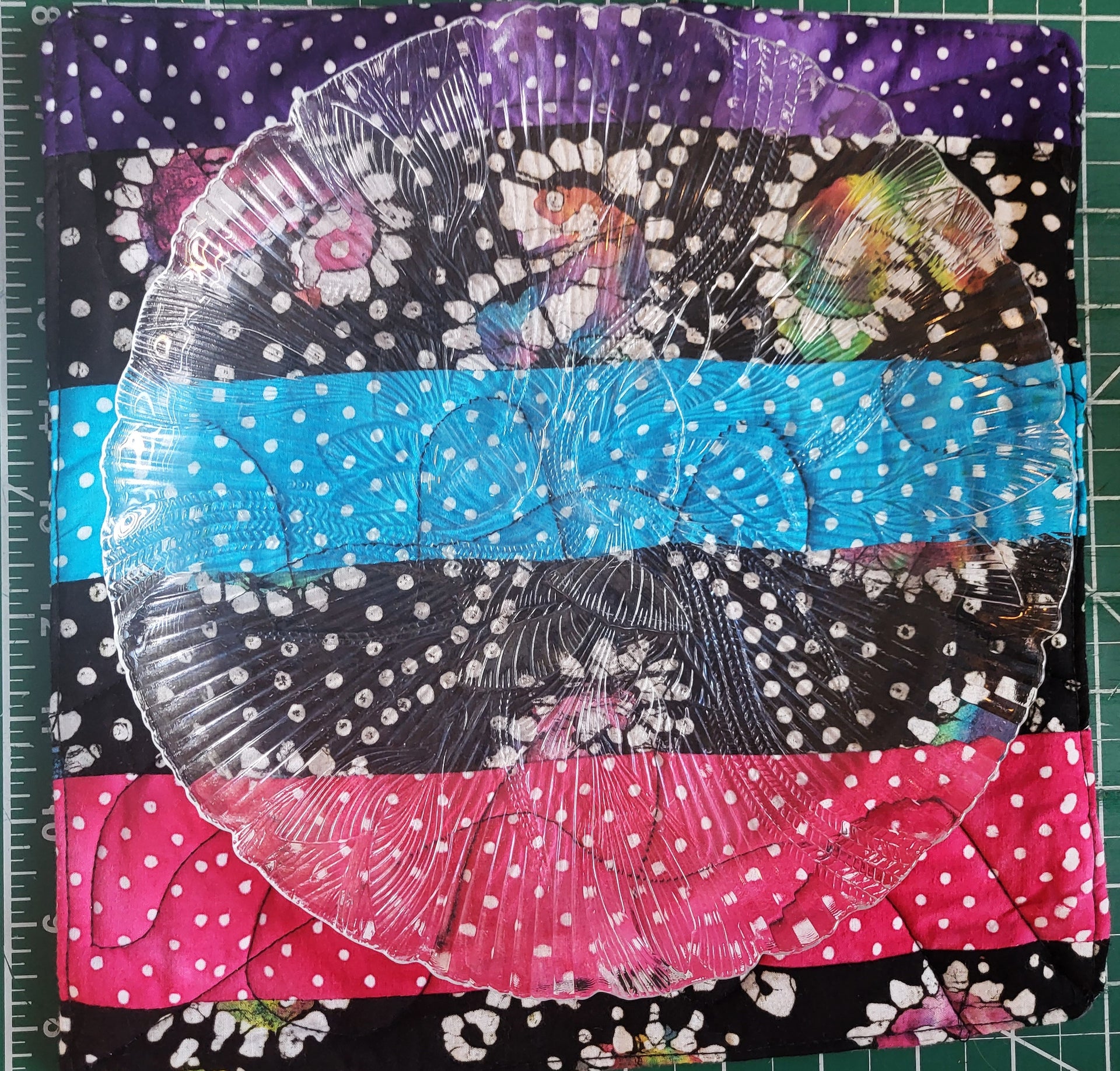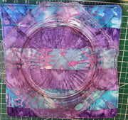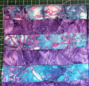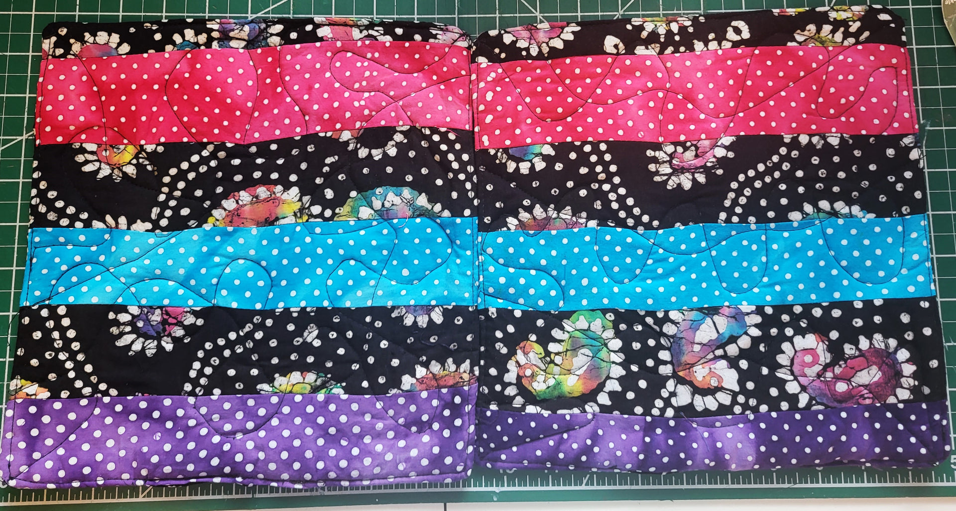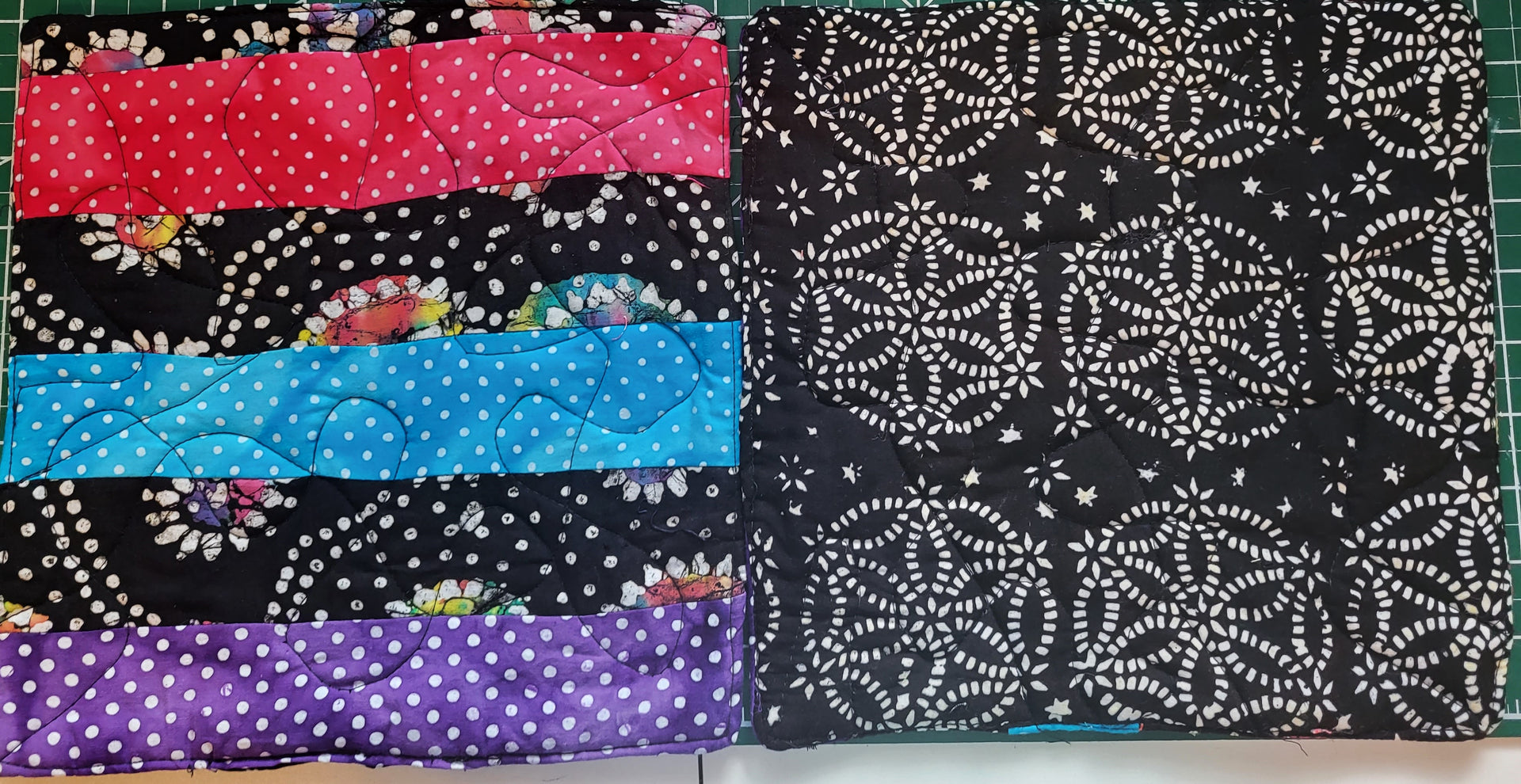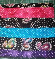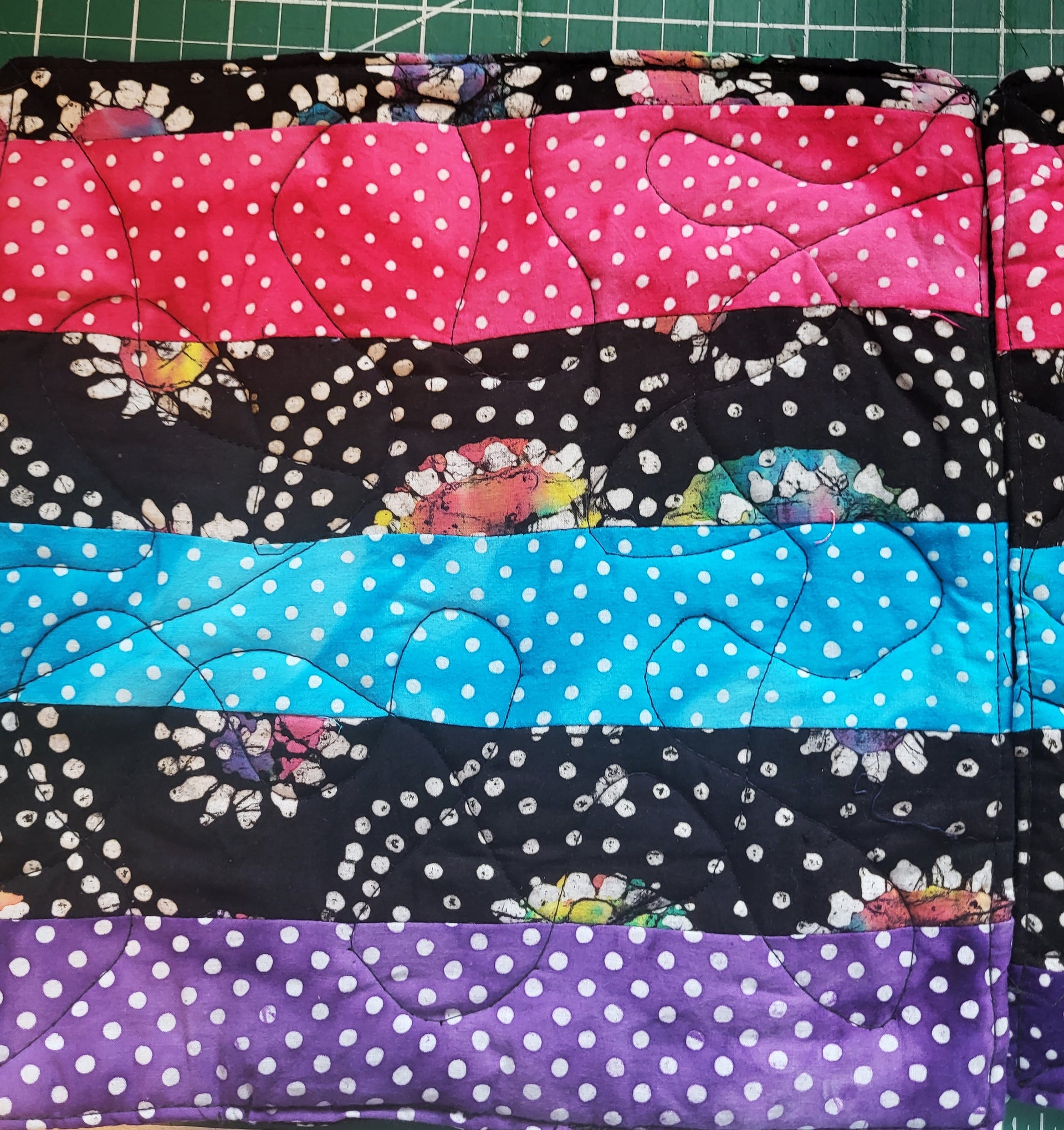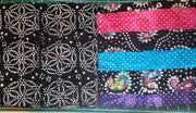 Mat choices:   Multi-black batik with coordinating polka dot purple, turquoise and pink batiks, reversible to a black white star flower batik.