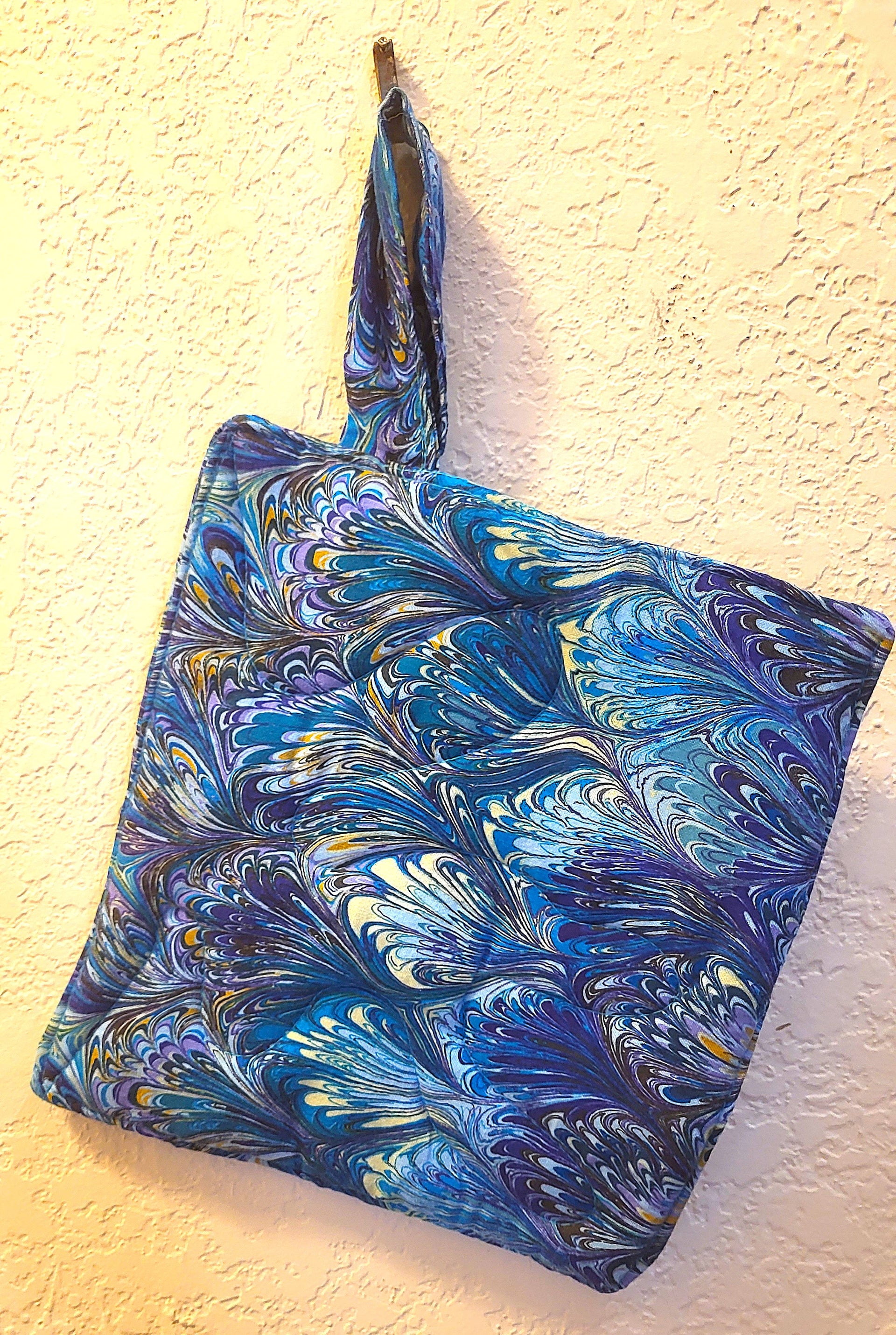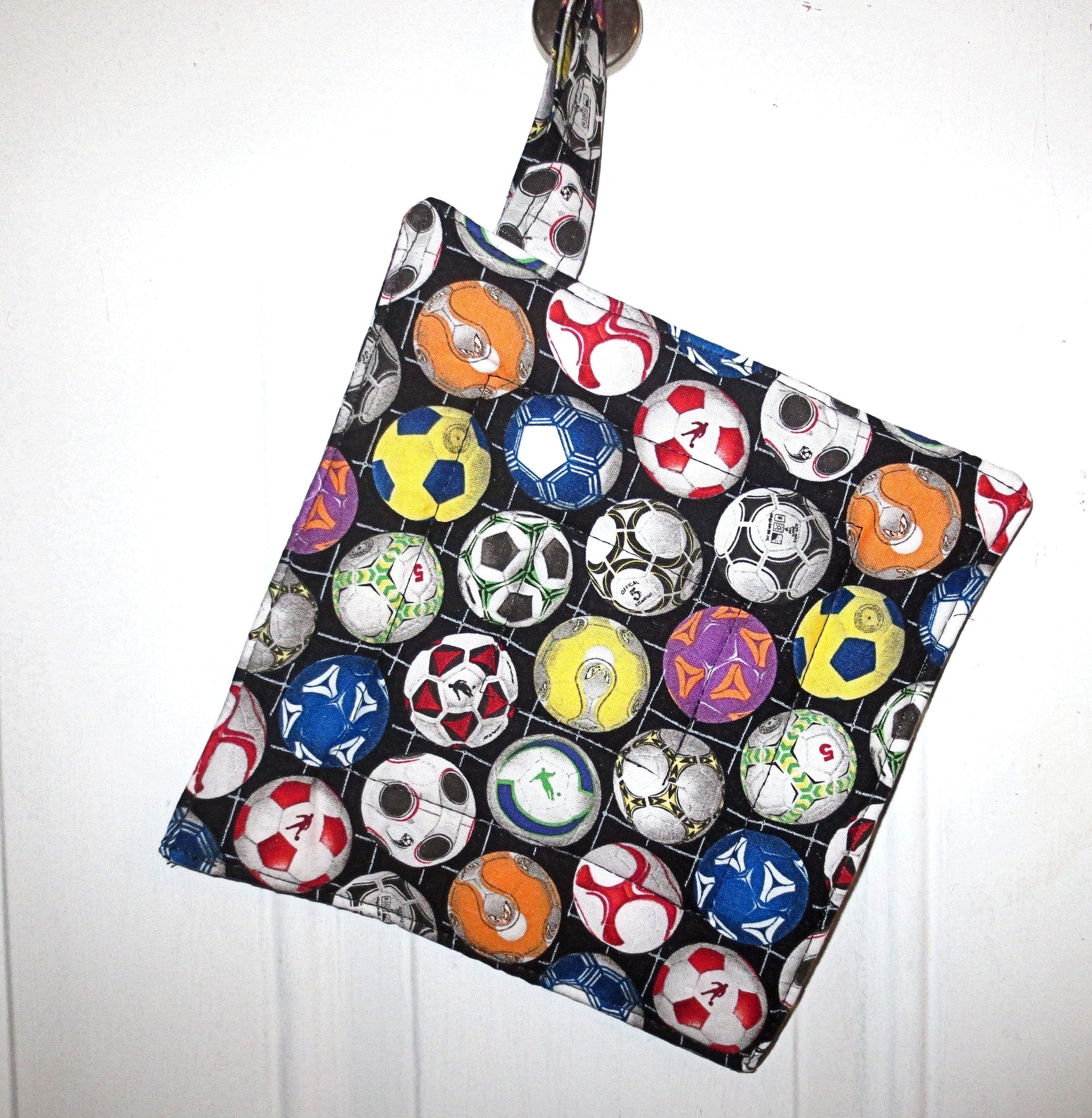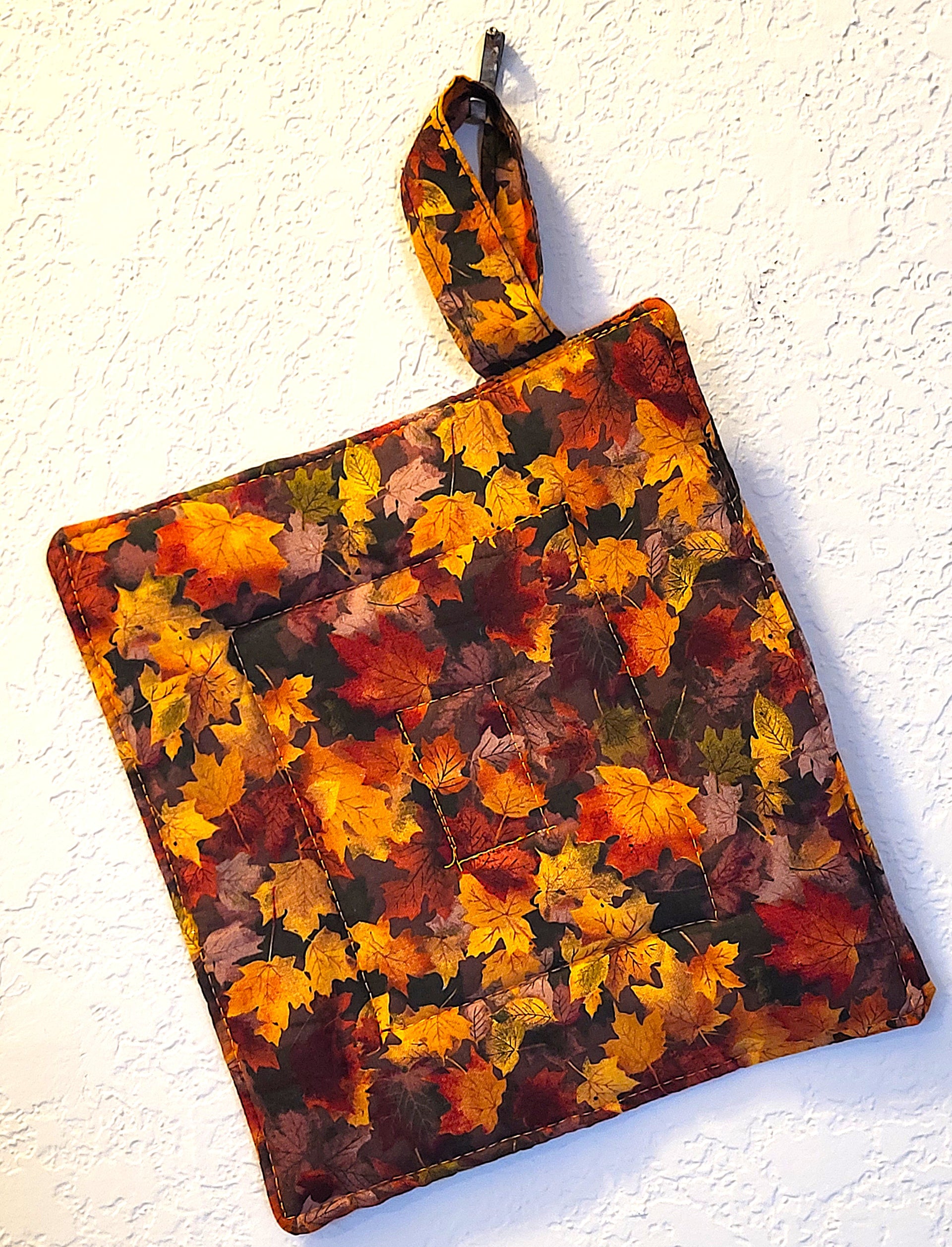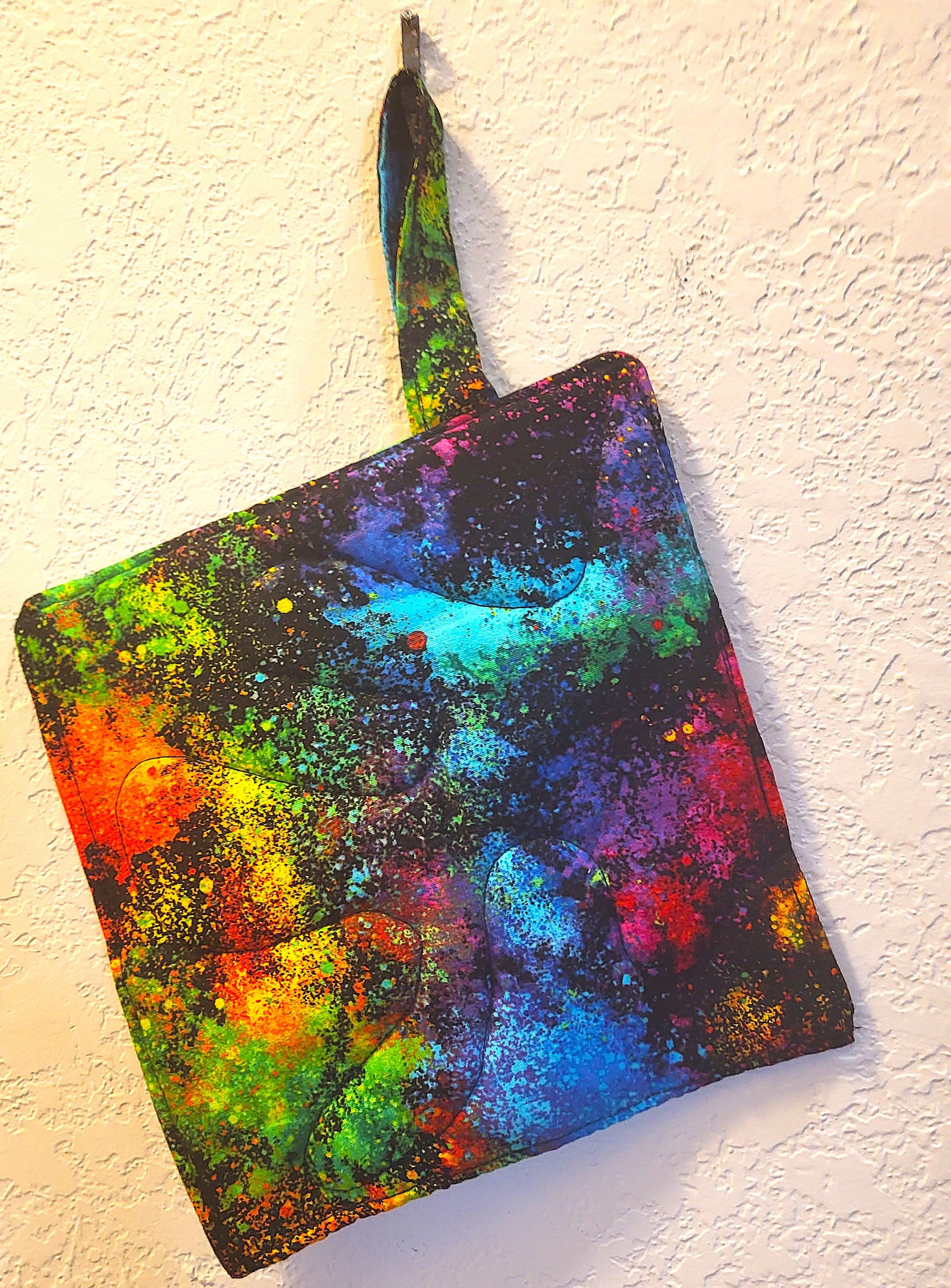 generous hanging handle of 3/4" wide x 4" long. One pot holder / trivet per purchase