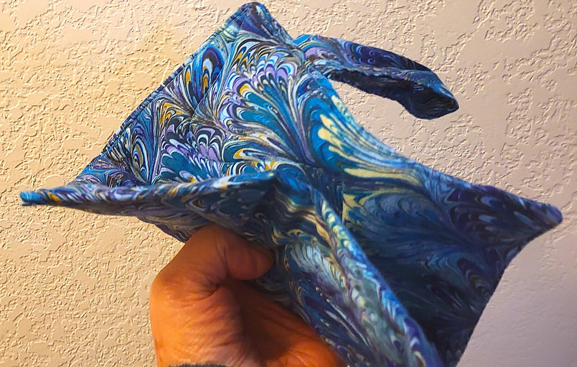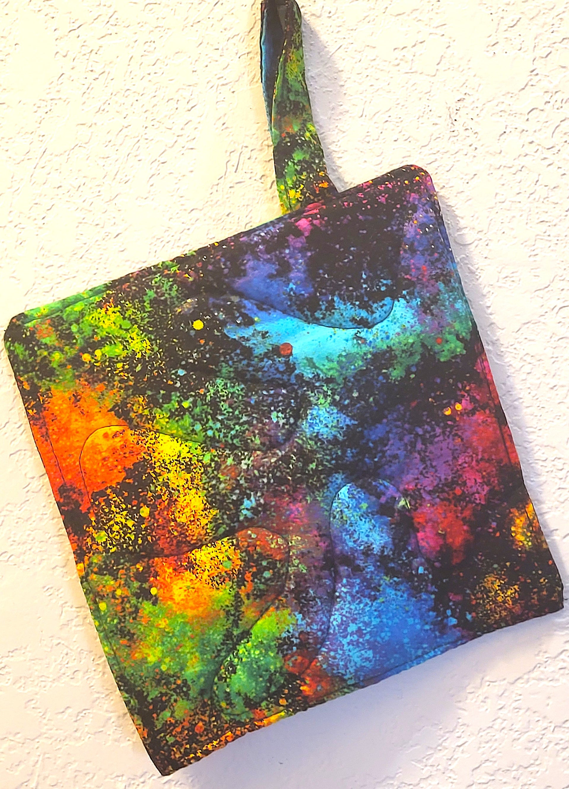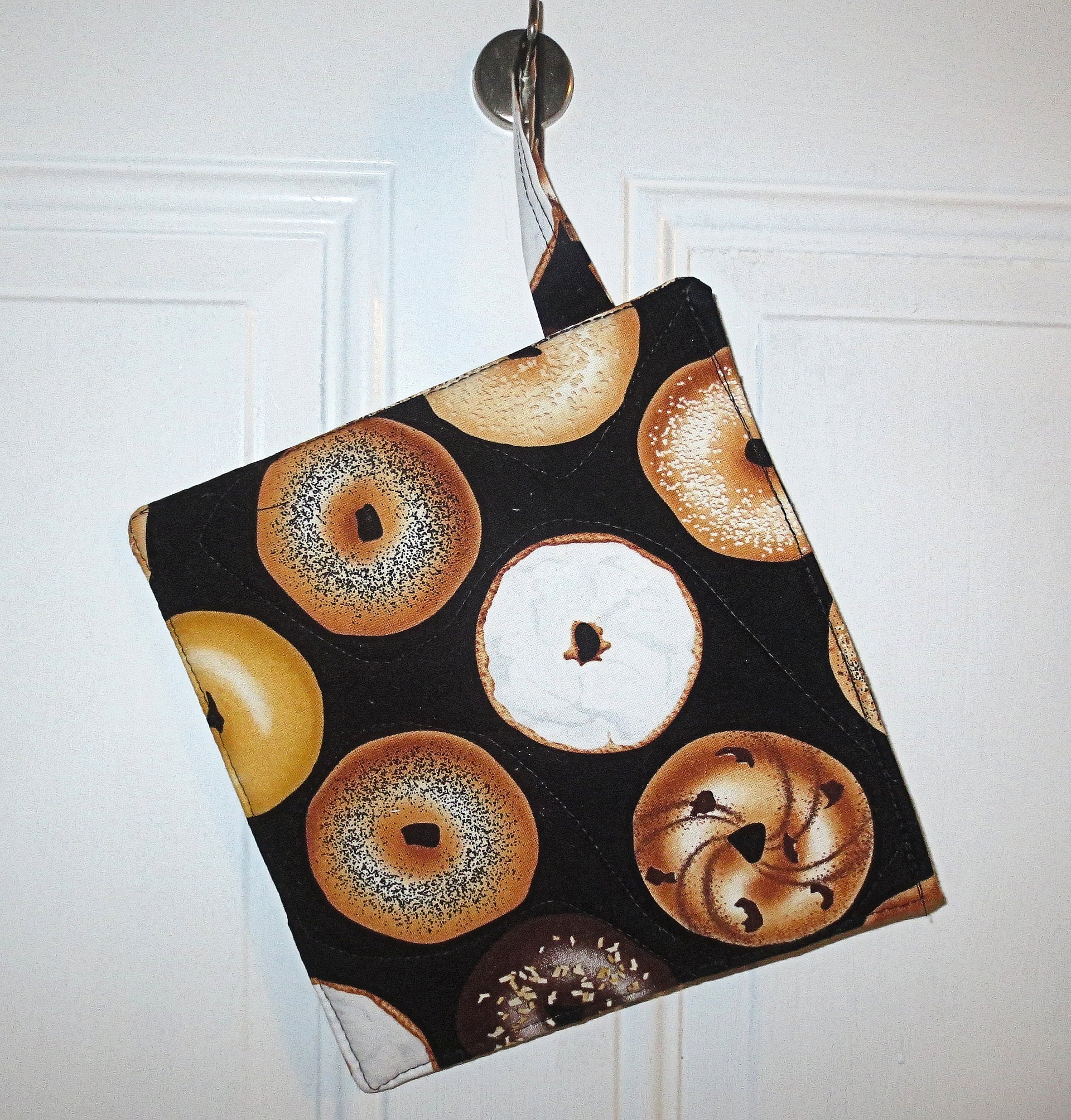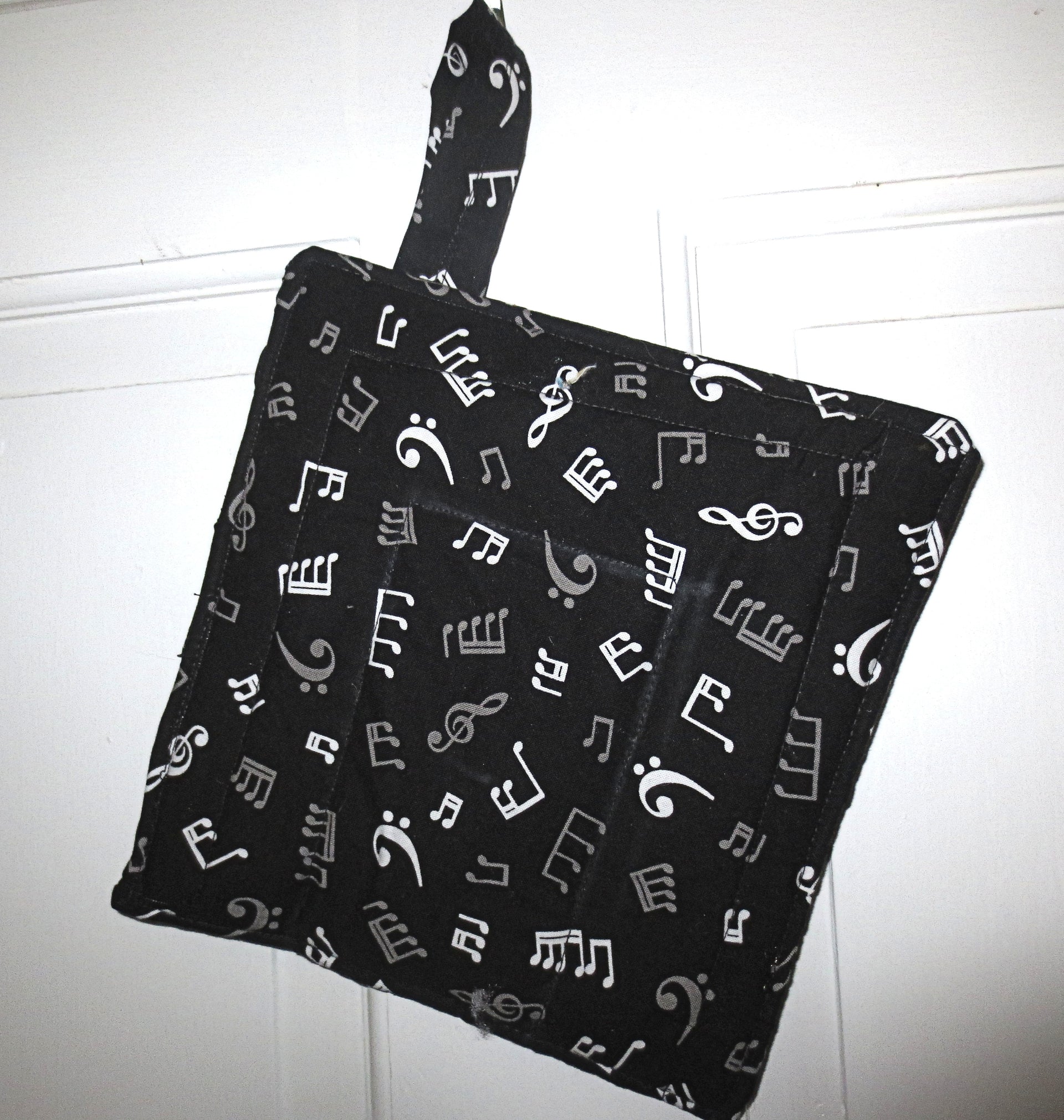 generous hanging handle of 3/4" wide x 4" long. One pot holder / trivet per purchase