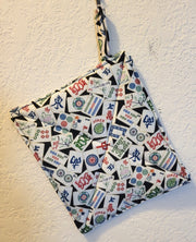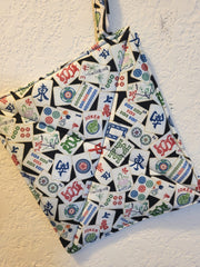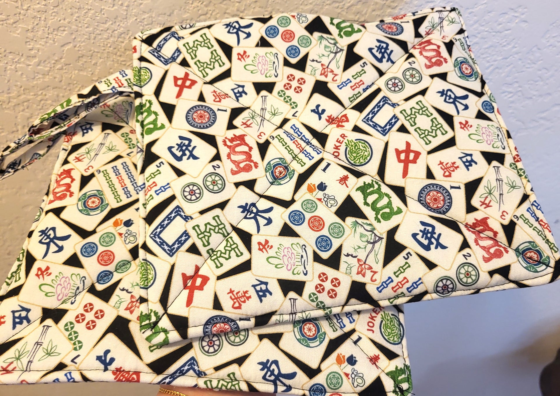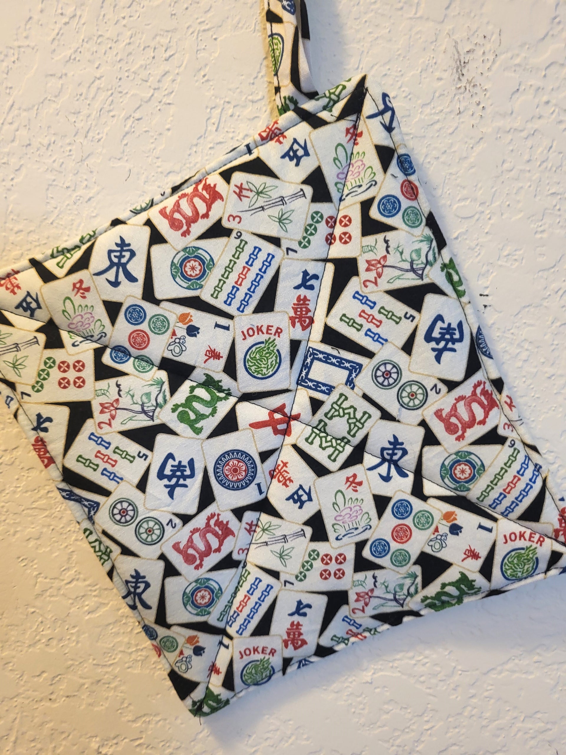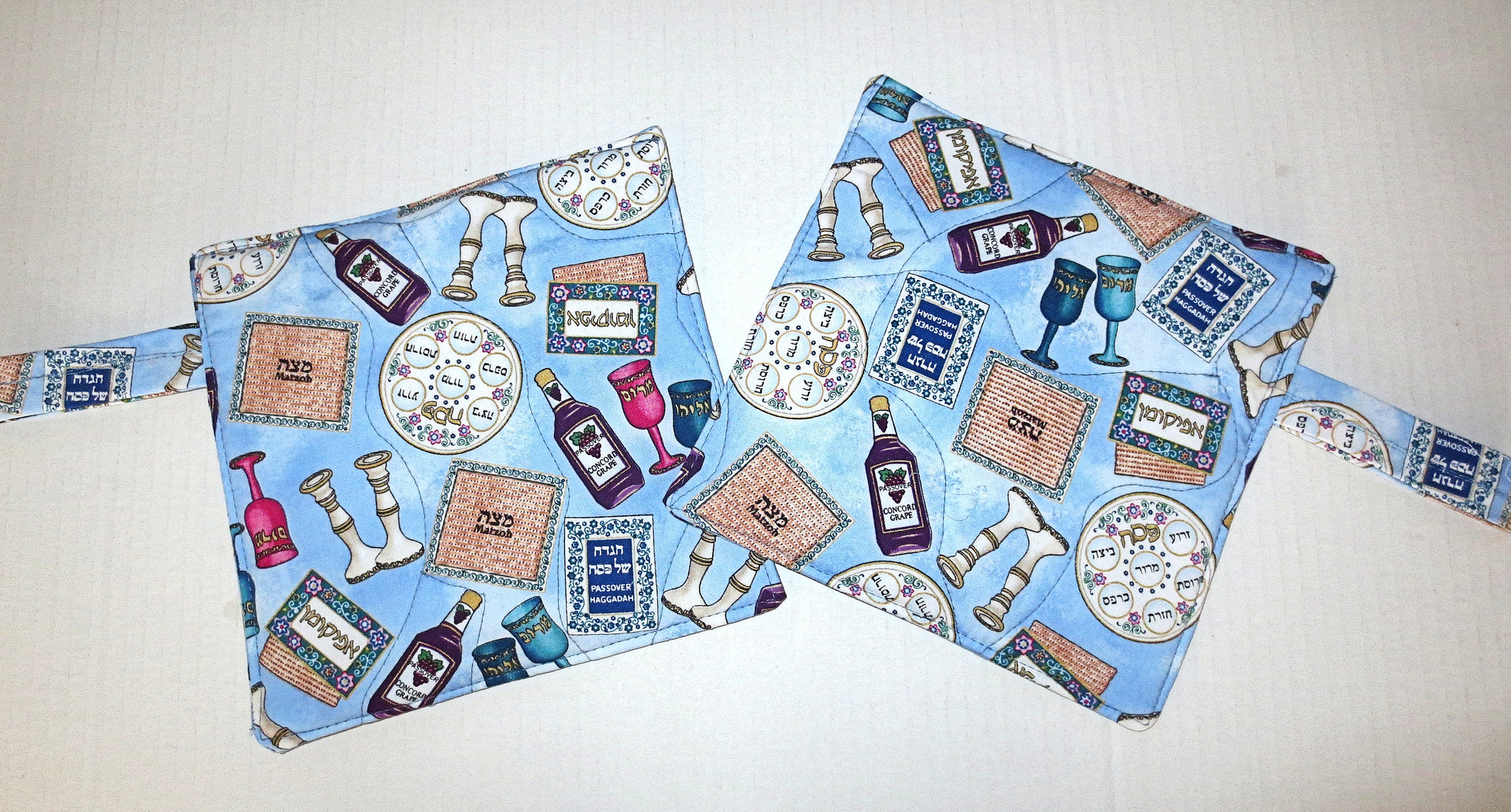 Quilted pot holders or trivets thick double insulated handmade useful home decor --Mahjong (2 patterns) Bagels, Star of Davids, Judaica themes, Latkes, Kiddush wine, Chanukah / Hanukkah themes, Passover matzah, Passover Seder rituals.